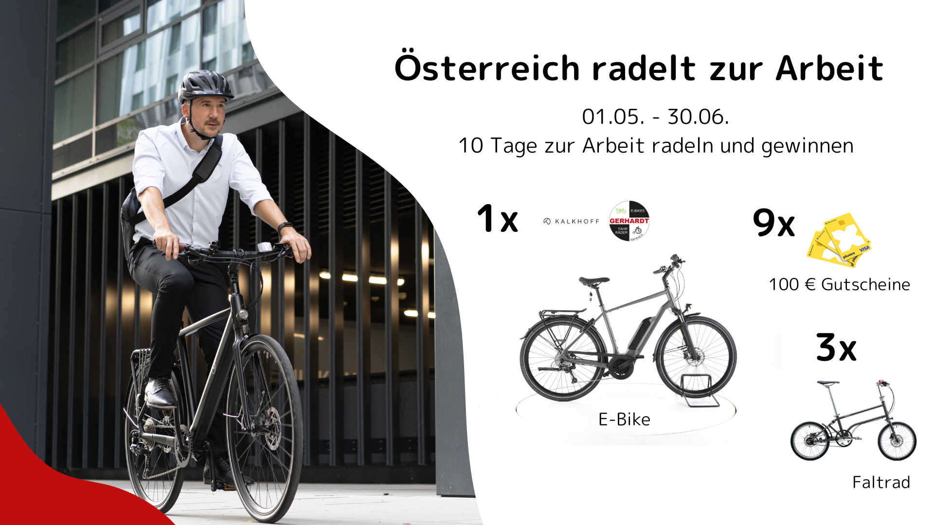 Es warten tolle Preise wie ein Kalkhoff E-Bike Endeavour von 2rad-shop Gerhardt, 3x VELLO Falträder und je ein 100 € Pluxee Gutschein pro Bundesland.